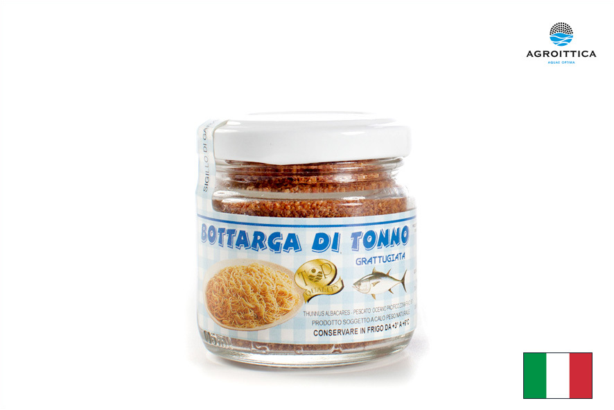 Die Bottarga di tonno sind Gelbflossen-Thunfischrogen, die von einem Beutel umhüllt sind, gesalzen, getrocknet und anschließend gerieben wurden. Kann man auf Vorspeisen, Croutons, Pasteten und Pizzen streuen.