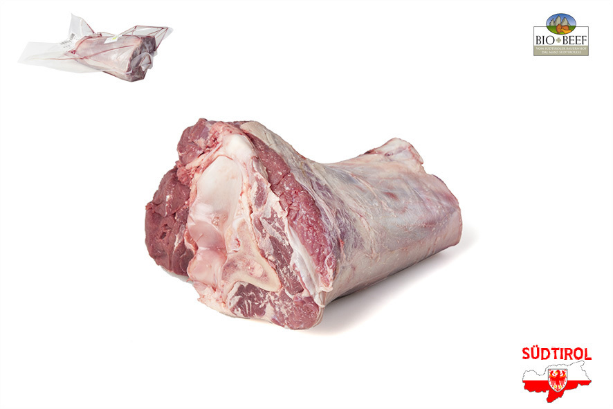 Rindfleisch gezüchtet von Südtiroler Bergbauern nach Richtlinien der biologischen Landwirtschaft. Nur tradizionelle Rassen der Alpen, Schlachtalter 10-12 Monate, nur Kalbinnen oder Ochsen, 2 Wochen in Hälften abgehangen. Die Haxe kann im ganzen gebraten oder auch zum Schneiden von Ossobuco verwendet werden. Auch entbeint zum Schneiden von Gulasch.