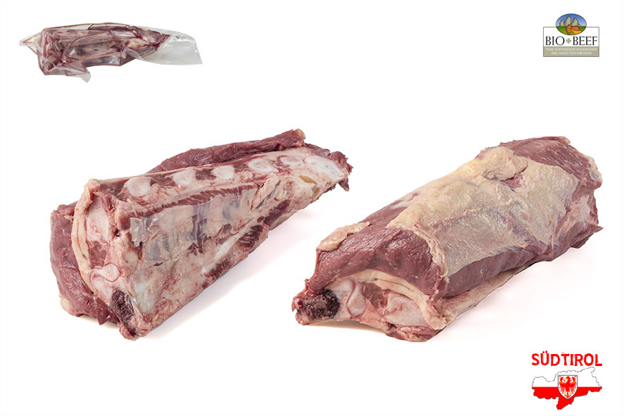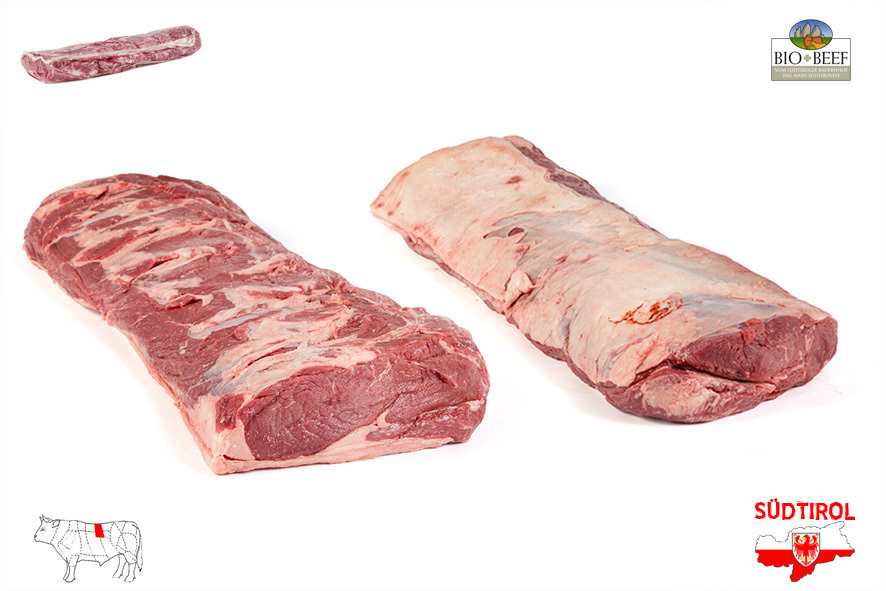 Rindfleisch gezüchtet von Südtiroler Bergbauern nach Richtlinien der biologischen Landwirtschaft. Nur tradizionelle Rassen der Alpen, Schlachtalter 10-12 Monate, nur Kalbinnen oder Ochsen, 2 Wochen in Hälften abgehangen. Das Roastbeef ist auf der Höhe der 3. Rippe abgeschnitten und sauber zugeputzt. Dieses eignet sich zum Schneiden von Steaks oder im Ganzen zu braten.