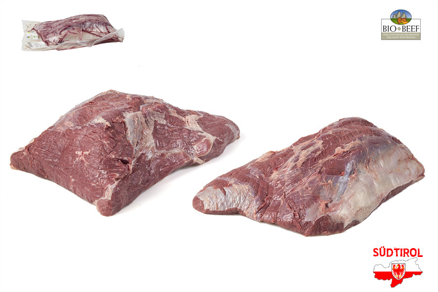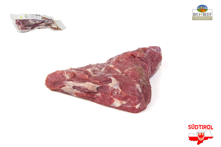 Rindfleisch gezüchtet von Südtiroler Bergbauern nach Richtlinien der biologischen Landwirtschaft. Nur tradizionelle Rassen der Alpen, Schlachtalter 10-12 Monate, nur Kalbinnen oder Ochsen, 2 Wochen in Hälften abgehangen. Das falsche Filet, auch Meisel genannt ist ein sehr magerer Muskel der Schulter und eignet sich fürs Gulasch oder als Tellerfleisch.