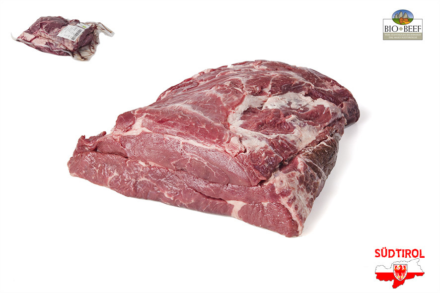 Rindfleisch gezüchtet von Südtiroler Bergbauern nach Richtlinien der biologischen Landwirtschaft. Nur tradizionelle Rassen der Alpen, Schlachtalter 10-12 Monate, nur Kalbinnen oder Ochsen, 2 Wochen in Hälften abgehangen. Die hohe Schulter eignet sich als gekochtes Rindfleisch, als Schmorbraten, aber auch fürs Gulasch.