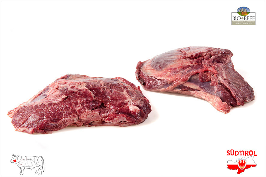 Rindfleisch gezüchtet von Südtiroler Bergbauern nach Richtlinien der biologischen Landwirtschaft. Nur tradizionelle Rassen der Alpen, Schlachtalter 10-12 Monate, nur Kalbinnen oder Ochsen, 2 Wochen in Hälften abgehangen. Gemischte magere Abschnitte der Schulter, ideal zum Schneiden von Gulasch oder für Hackfleisch.