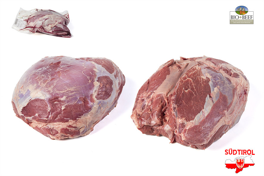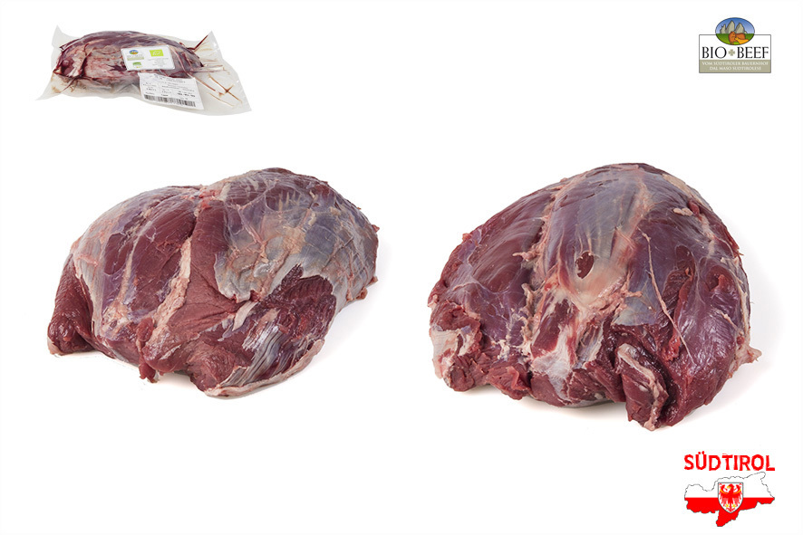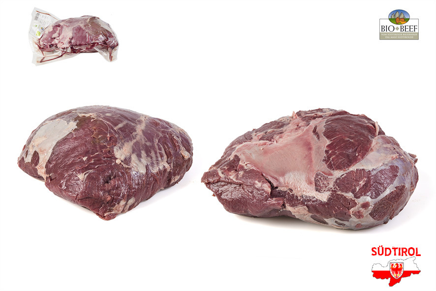 Rindfleisch gezüchtet von Südtiroler Bergbauern nach Richtlinien der biologischen Landwirtschaft. Nur tradizionelle Rassen der Alpen, Schlachtalter 10-12 Monate, nur Kalbinnen oder Ochsen, 2 Wochen in Hälften abgehangen. Die Nuss kann als Braten, aber auch geschnitten für Steaks verwendet werden.