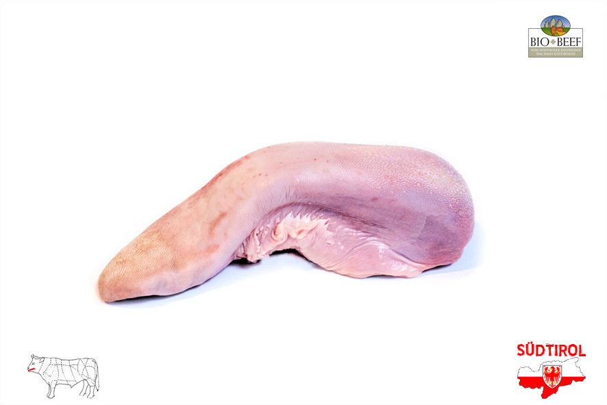 Rindfleisch gezüchtet von Südtiroler Bergbauern nach Richtlinien der biologischen Landwirtschaft. Nur tradizionelle Rassen der Alpen, Schlachtalter 10-12 Monate, nur Kalbinnen oder Ochsen, 2 Wochen in Hälften abgehangen. Die Zunge ist roh und vakuum verpackt.