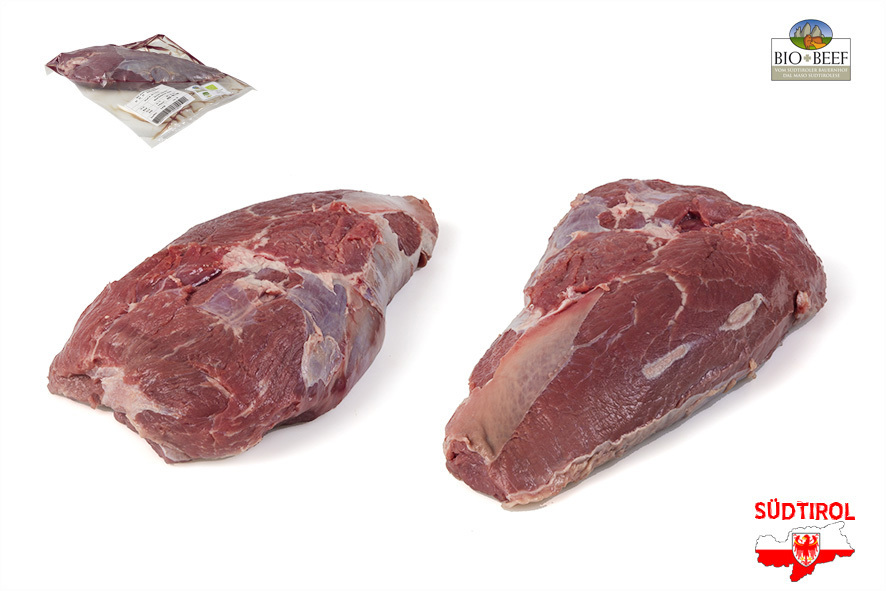 Rindfleisch gezüchtet von Südtiroler Bergbauern nach Richtlinien der biologischen Landwirtschaft. Nur tradizionelle Rassen der Alpen, Schlachtalter 10-12 Monate, nur Kalbinnen oder Ochsen, 2 Wochen in Hälften abgehangen. Das Schulternahtl eignet sich als Schmorbraten oder fürs Gulasch.