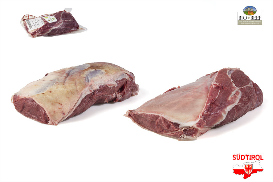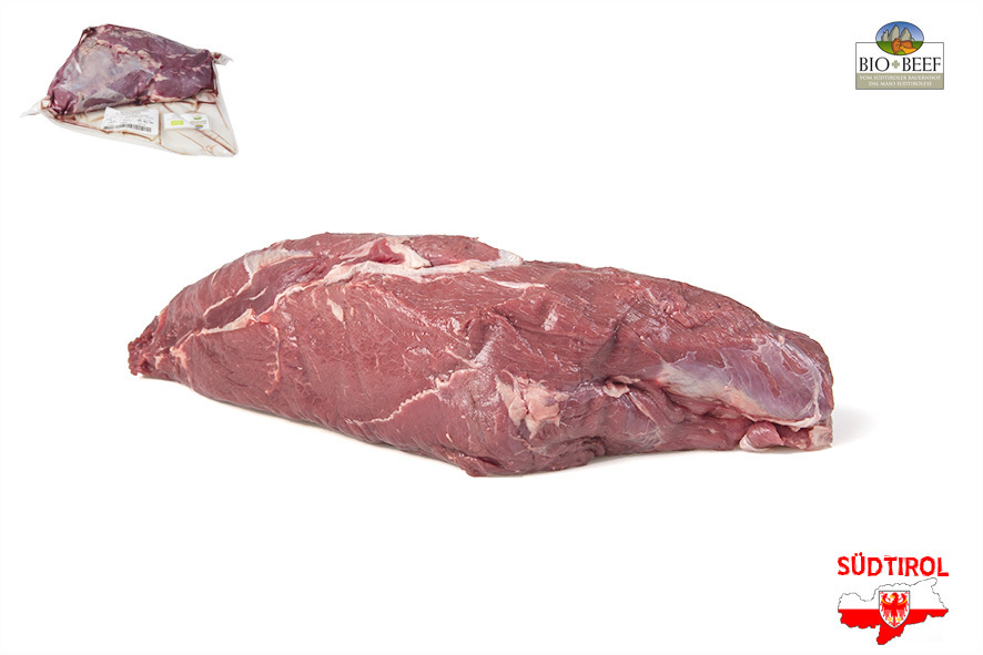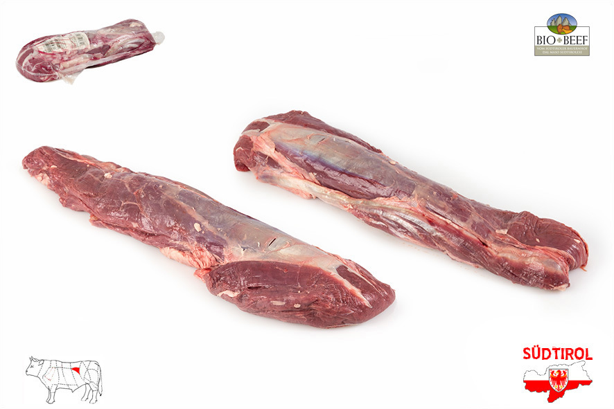 Rindfleisch gezüchtet von Südtiroler Bergbauern nach Richtlinien der biologischen Landwirtschaft. Nur tradizionelle Rassen der Alpen, Schlachtalter 10-12 Monate, nur Kalbinnen oder Ochsen, 2 Wochen in Hälften abgehangen.Das Filet ist mit Kette und eignet sich zum Kurzbraten.
