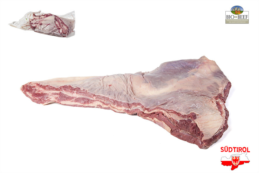 Rindfleisch gezüchtet von Südtiroler Bergbauern nach Richtlinien der biologischen Landwirtschaft. Nur tradizionelle Rassen der Alpen, Schlachtalter 10-12 Monate, nur Kalbinnen oder Ochsen, 2 Wochen in Hälften abgehangen. Der Bauch kann im Ganzen gebraten oder das Magerfleisch für die Verarbeitung verwendet werden.