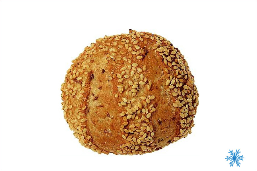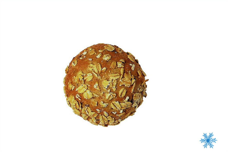 Vorgebacktes Brot, Durchmesser ca 5 cm, mit Weizenmehl, Roggenmehl, nat. Sauerteig, Sojaschrot. Im vorgeheizten Heißluftherd bei 210° C für circa 6/8 Minuten fertig backen.