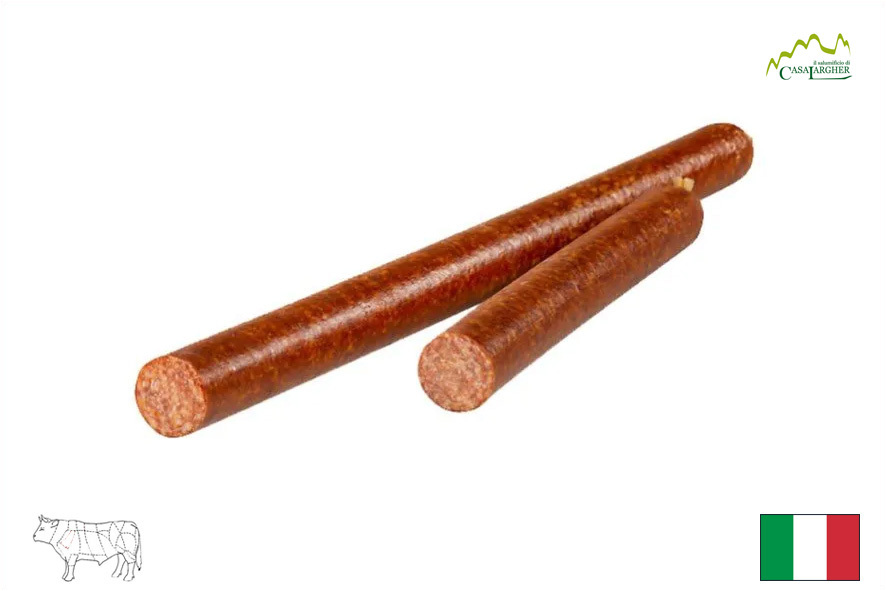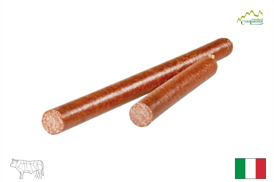 Diese milde Salami wird nur aus Rindfleisch hergestellt, und diese ist schon geschält und deshalb ohne grossen Arbeitsaufwand in Scheiben geschnitten. Ideal als Aufschnitt, fürs Frühstücksbuffet oder für Antipasti, oder zum Belegen von Pizza.