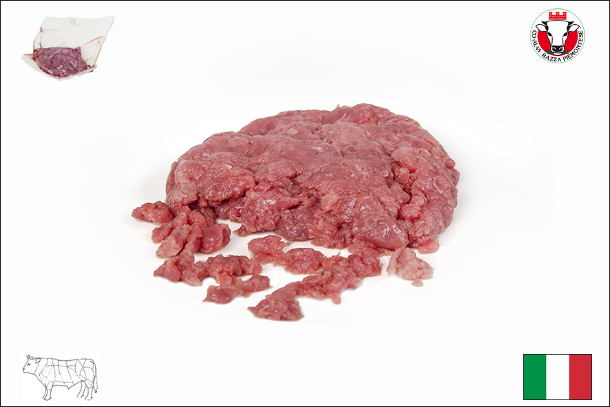 Mageres Keulenteil von Rindfleisch piemontesischer Rasse. Dieses Rindfleisch ist bekannt für seinen ausgezeichneten Geschmack und seinen sehr niederen Fettanteil. Schon faschiert fürs Tartar und in praktischen Mono-Portions-Beuteln verpackt.