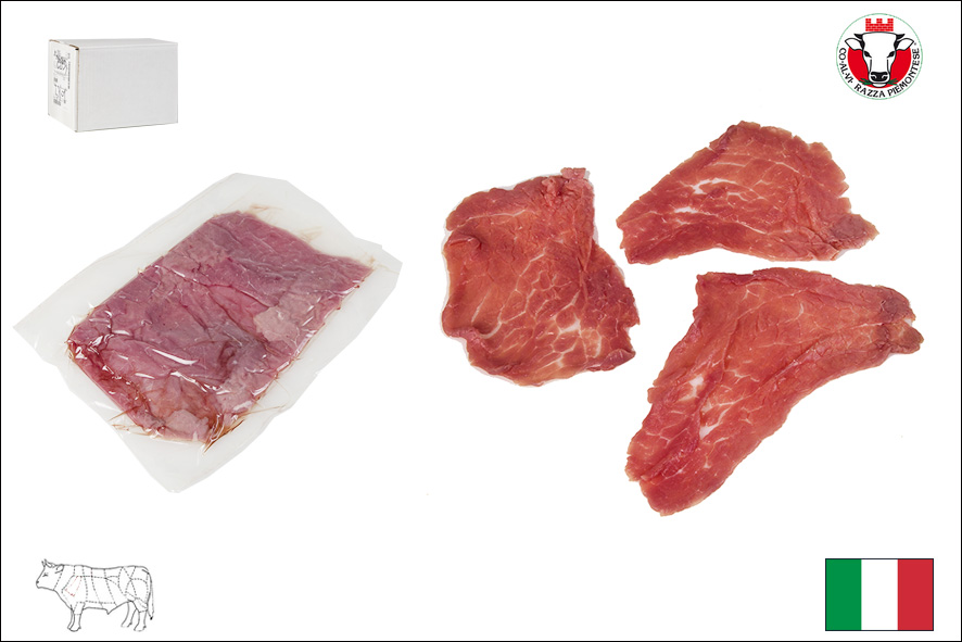 Mageres Keulenteil von Rindfleisch piemontesischer Rasse. Dieses Rindfleisch ist bekannt für seinen ausgezeichneten Geschmack und seinen sehr niederen Fettanteil. In dünnen Scheiben geschnitten und in praktischen Mono-Portions-Beuteln verpackt. Nur Beutel öffnen und direkt aufs Teller legen.