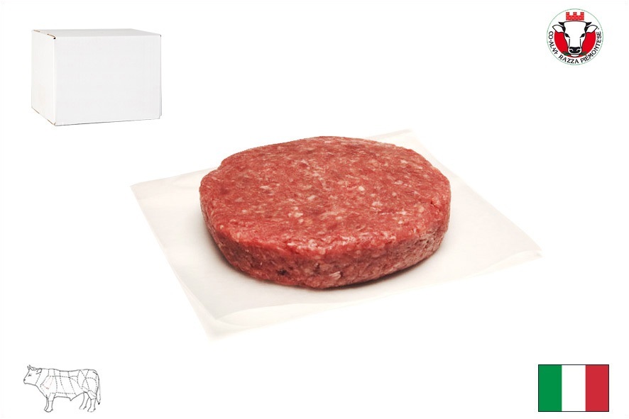 Hamburger aus 100% magerem Rindfleisch der piemontesischen Rinderrasse "FASSONA". Dieser beinhaltet nur Fleisch und sehr wenig Salz. Durchmesser 12 cm und Höhe 1,7 cm. Ideal für die Zubereitung auf der Grillplatte.