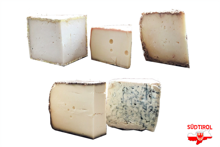 Sortiment mit 5 verschiedenen Sorten, welche im Bunker gelagert wurden (Caprino, Berggenuss, Pecorino, Genussjäger, Blauer Höhlengenuss). Ideal für den Käsewagen.