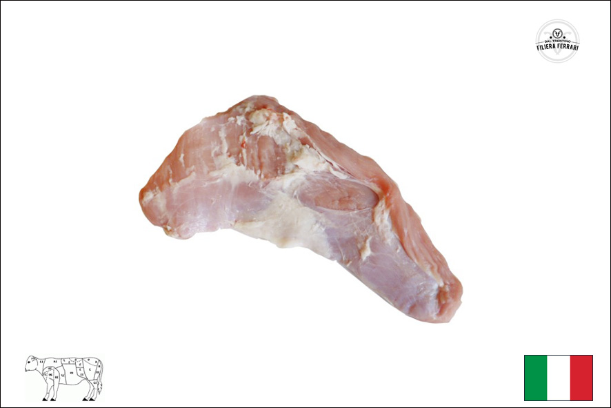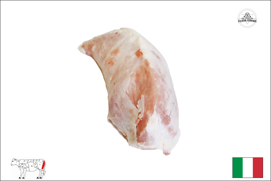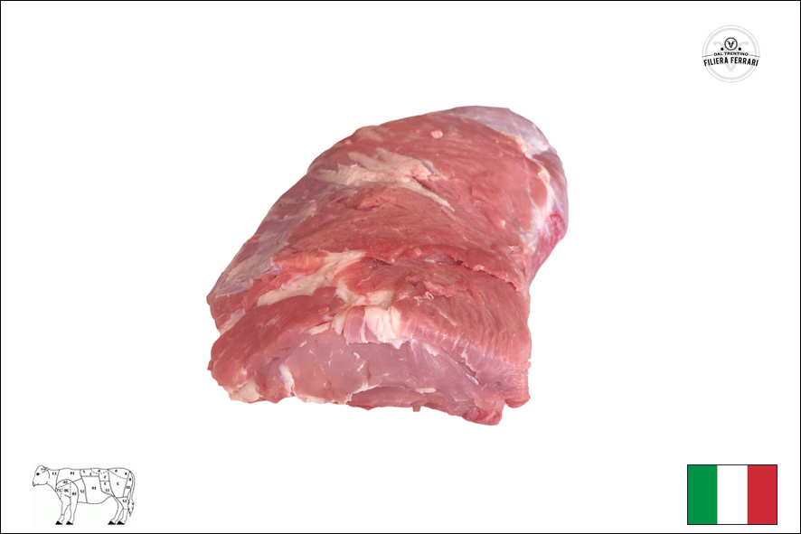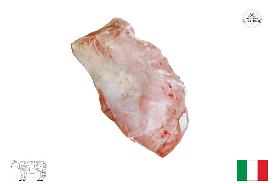 Kalbfleisch höchster Qualität ; Helles Fleisch; geboren in Südtirol/Trentino, gemästet im Trentino (Roveré della Luna), geschlachtet und zerlegt im Trentino (Fleimstal); Fütterung OMG-free; Die hohe Schulter ist ein magerer und kompakter Muskel der Schulter; Geeignet zum Braten oder zum Schneiden von Gulasch.