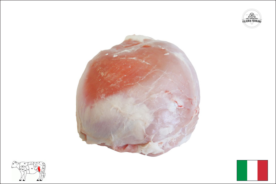 Schweinekarree ohne Knochen mit Schwarte von italienischem Schweinefleisch welches mit "QUALITÀ TRENTINO" ausgezeichnet ist.