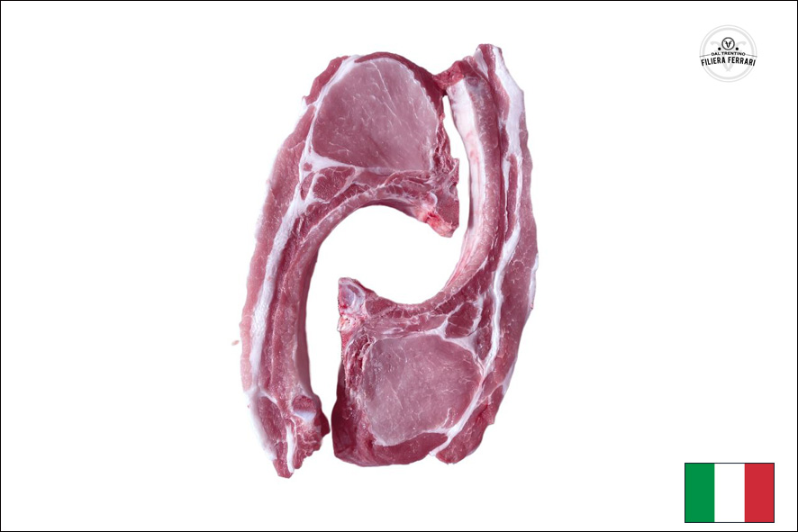 Schweinekotelett "Gitarre" von im Trentino geborenen, gemästeten und geschlachteten Schwein.. Mit langen Rippenknochen mit Fleisch ohne Spanrippe.