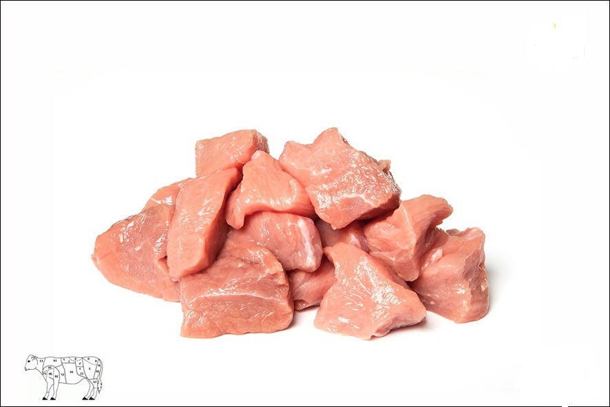 Kalbfleisch höchster Qualität ; Helles Fleisch; geboren in Südtirol/Trentino, gemästet im Trentino (Roveré della Luna), geschlachtet und zerlegt im Trentino (Fleimstal); Fütterung OMG-free; Mageres Gulasch in ca. 2 x 2 cm grosse Stücke geschnitten und vakuum verpackt.