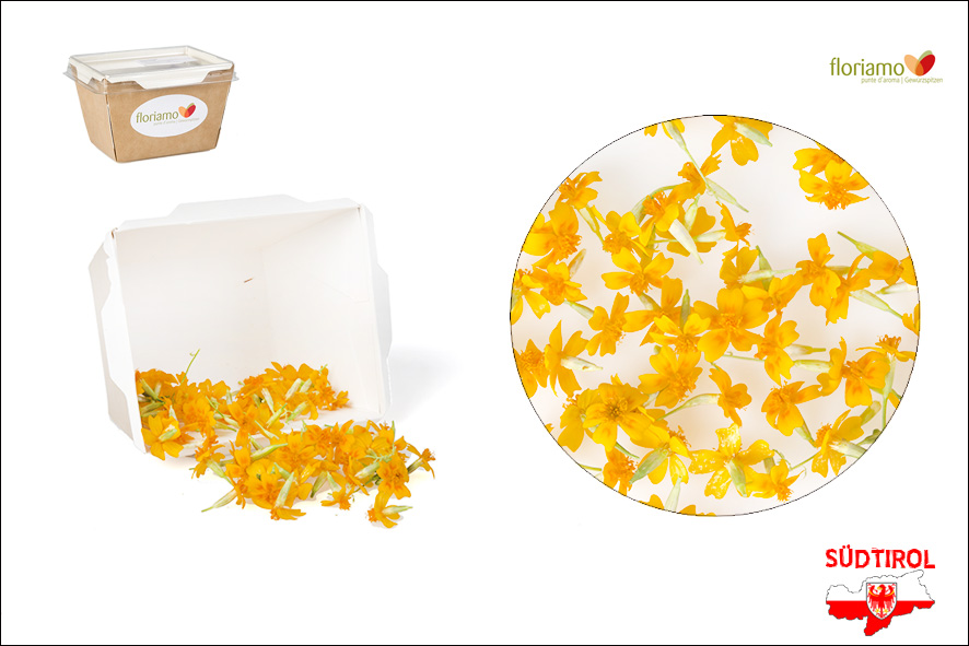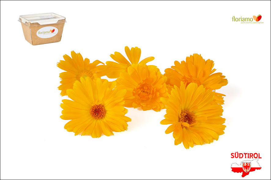 Essbare gelb- orange Ringelblumen. Mindestens 10 Blüten pro Schale. Gut geeignet für jede Art von Gerichten, speziell Salaten, gibt sie eine schöne Note und einen etwas herben Geschmack.