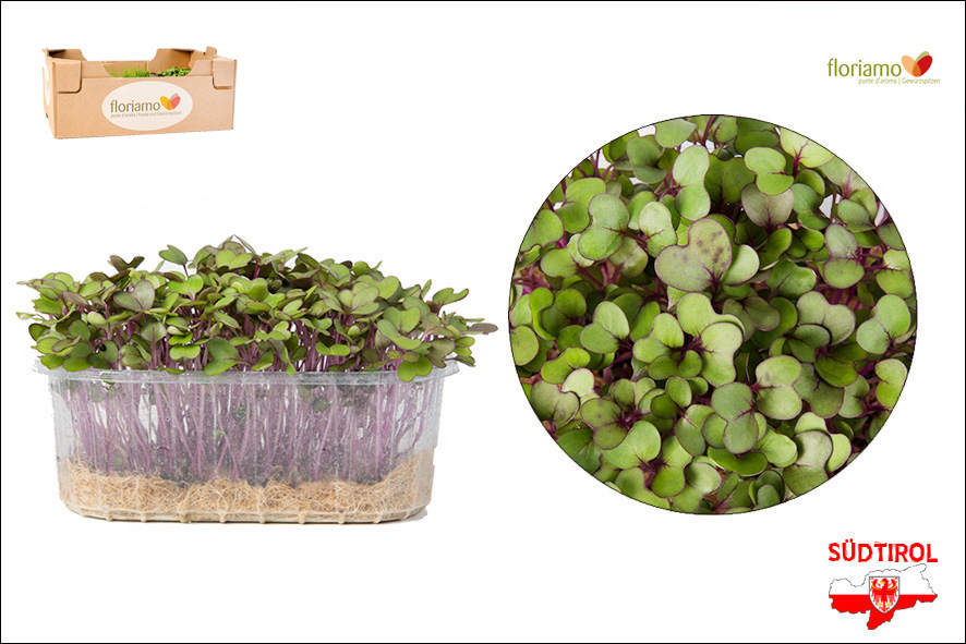 Die Rotkohl Kresse, mit seinem roten dekorativen Blatt, passt in Salate, Suppen und Dips. Oder als Dekoration zu vielen Speisen geeignet.