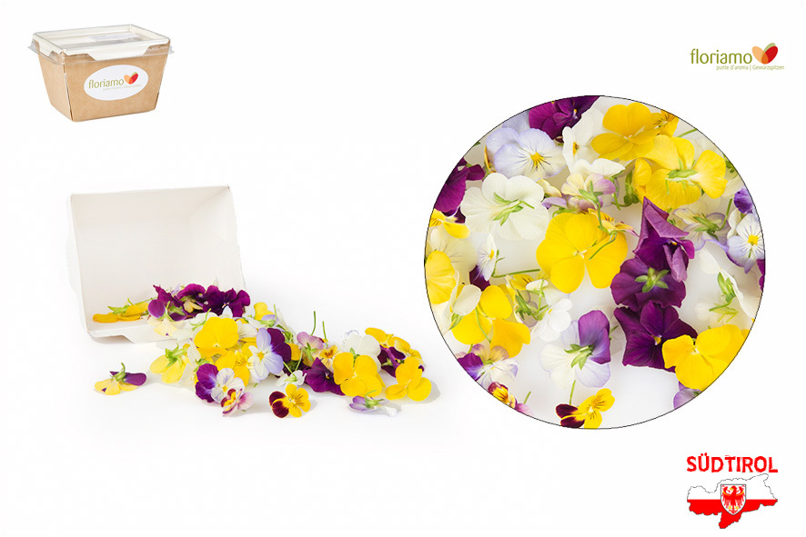 Essbare Veilchen Blüten, in verschiedenen Farben und Größen. Mindestens 40 Blüten pro Schale. Eignet sich hervorragend als Dekoration oder als bunte Beigabe in Salat, Suppen und Tellergerichten. Die kleinblumigen Viola machen Freude auf jedem Teller.