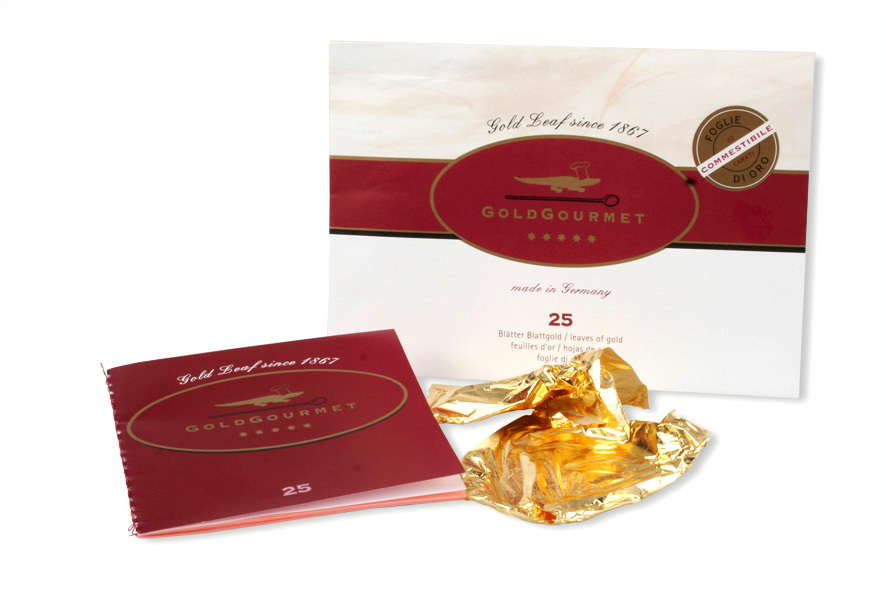 Diese praktische Blattgold-Box enthält 20 Umschläge mit jeweils 12 Blättern echtes Blattgold. GoldGourmet Blattgold hat eine ungefähre Stärke von 0,000125 mm und zergeht somit förmlich auf der Zunge des Gourmets. Das Blattgold hat ein besonderes Format von 5 x 5 cm.