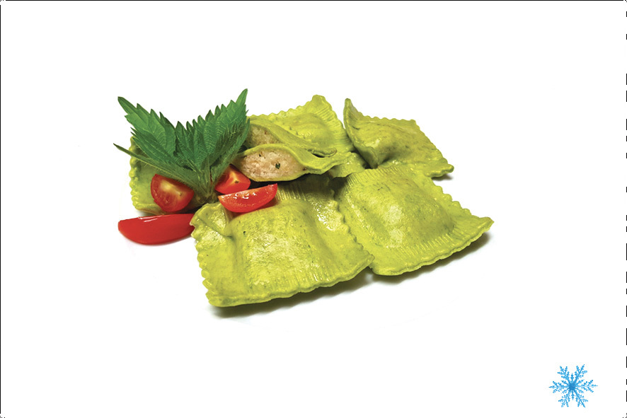 Südtiroler Schlutzkrapfen. Hergestellt aus besten Rohstoffen nach traditionellem Rezept; mit Roggenmehl, Spinat, Topfen und Kartoffel. In leicht gesalztes Kochwasser für 9/10 min. geben und mit zerlassener Butter und Parmesankäse servieren.