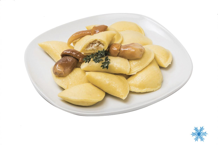 Typische Teigtaschen (Halbmond) aus Kartoffelteig, gefüllt mit Steinpilze. Einfach noch gefroren in kochendes Wasser geben.