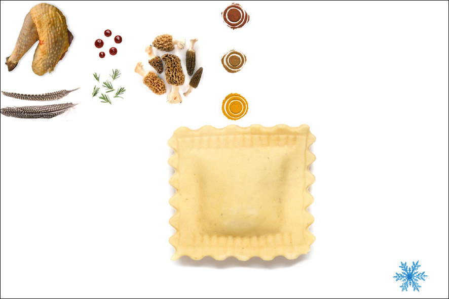 Tiefgefrorene Pasta nach italienischer Tradition, kreiert und hergestellt in einem innovativen Labor im Piemont mit ausgewählten Zutaten von höchster Qualität. Gewicht ca. 11 gr, mit 40 % Mascarpone in der Füllung und Trüffel im Teig. Serviervorschläge: mit Butter und Grana Padano, Spargel und Krabbenragout oder Butter, Haselnuss und gerösteten Haselnusskernen. Kochzeit: 4 Min.