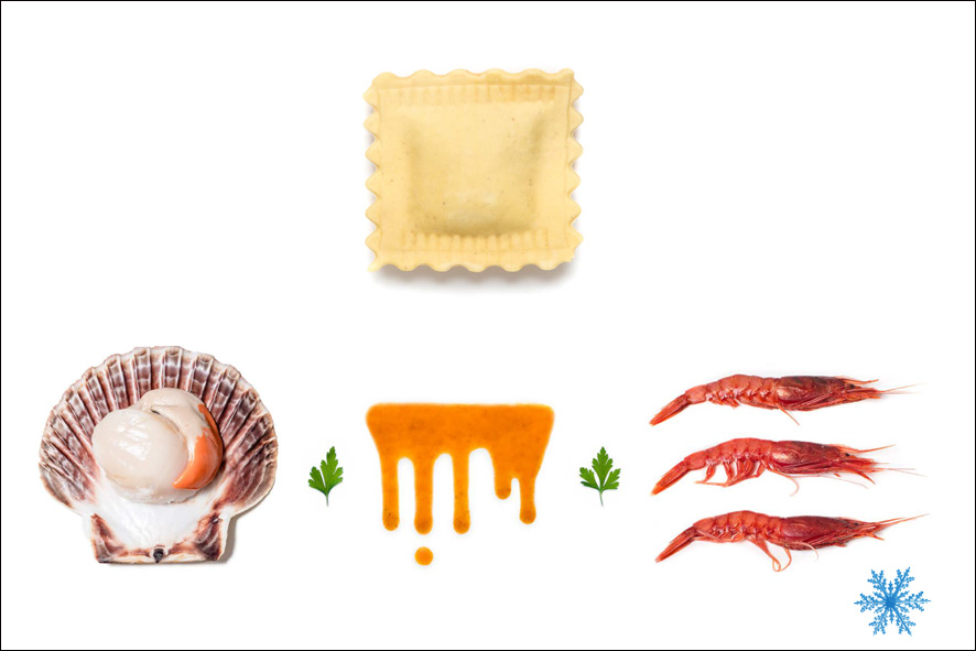 Tiefgefrorene Pasta nach italienischer Tradition, kreiert und hergestellt in einem innovativen Labor im Piemont mit ausgewählten Zutaten von höchster Qualität. Gewicht etwa 15 g, mit 33 % Garnelen und 19 % Jakobsmuscheln in der Füllung. Serviervorschläge: Basilikum-Tomaten-Confit. Olivenöl extra vergine, Schnittlauch und Majoransauce. Garnelenragout und frische Tomaten.