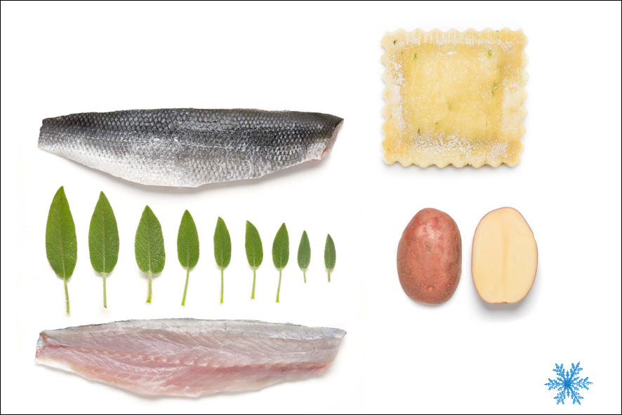 Tiefgefrorene Pasta nach italienischer Tradition, kreiert und hergestellt in einem innovativen Labor im Piemont mit ausgewählten Zutaten von höchster Qualität. Gewicht ca. 11 g, mit 35 % Wolfsbarsch in der Füllung und Salbei im Teig. Serviervorschläge: Taggiasca-Oliven-Kapern-Sauce. Datterini-Tomaten, Oliven und Pinienkerne. Butter, Bratkartoffelwürfel und Salbei.