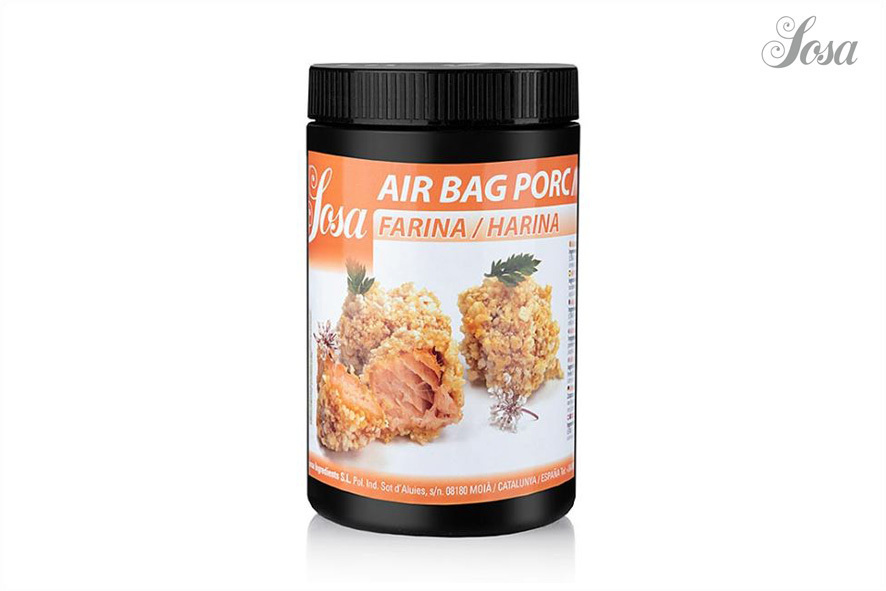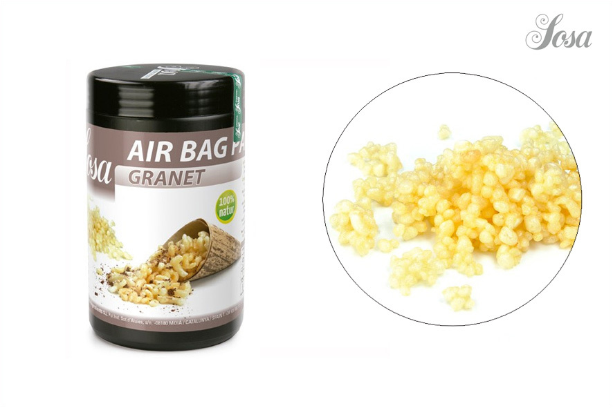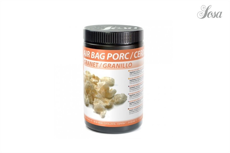 Sosa Airbag Granet ist getrocknete und fein pulverisierte Schweineschwarte. Durch Frittieren oder in der Pfanne ausbacken, lässt sich daraus "Popcorn" herstellen - als deftig-knusprige Beilage oder Topping für ein würziges Gaumenfeeling.