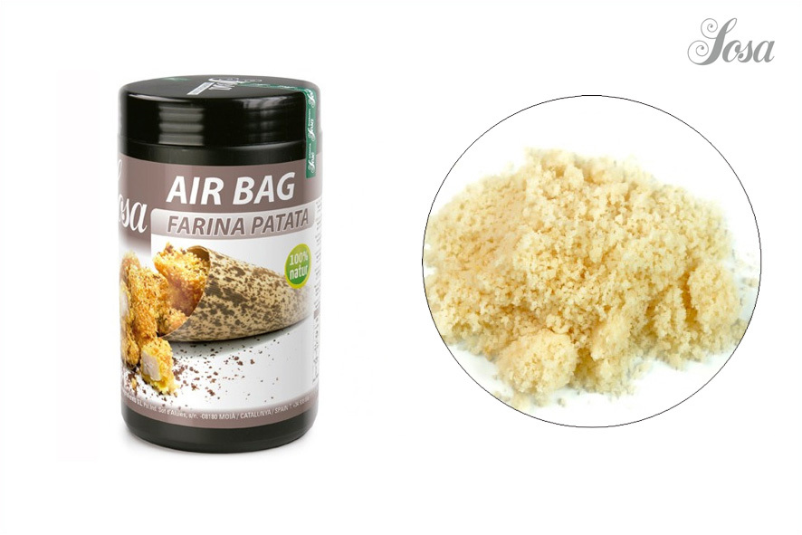 Sosa Air bag patata ist eine getrocknete und granulierte Kartoffelzubereitung. Das feine Granulat ist zum Panieren geeignet und schützt das Gargut vor zu viel Hitze. Beim Frittieren oder in der Pfanne ausbacken, wird die würzige Panade knusprig fein.