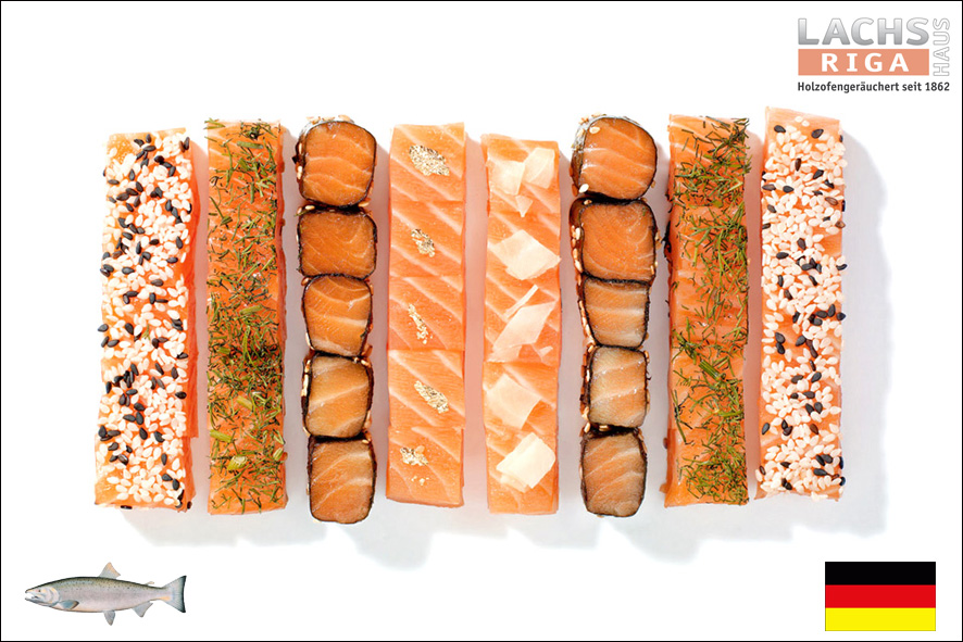 Ausschließlich von Hand geschnitten und mit viel Fingerspitzengefühl portioniert aus dem Feinsten im Hause Riga - aus des Zaren liebstes Stück, dem Original Filet Gourmet. Jedes Kunststück wird akzentuiert mit echtem Blattgold, einer Messerspitze würzigem Dill, aromatischem Ingwer - oder mit Noriblatt und Sesam zum exotischen Asia Pralinée vollendet.