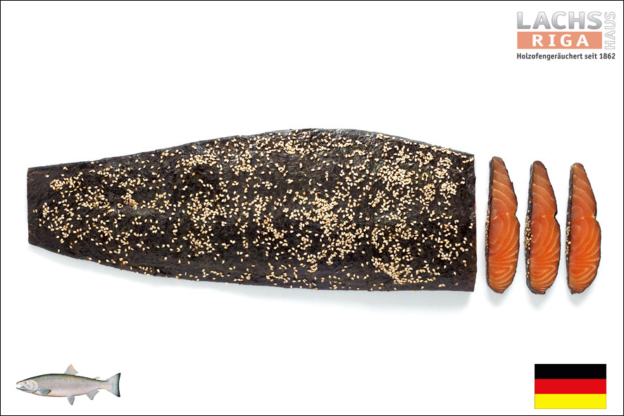 Zart mariniertes Filet vom schottischen Salmo Salar, abgerundet mit einer feinen Note Ingwer und einer exotisch angestimmten Geheimrezeptur, behutsam in ein Noriblatt mit frisch geröstetem Sesam gewickelt. So definiert die "Komposition Asia" einen neuen kulinarischen Lifestyle: Exklusivität in exotischer Lebensart. In einer Packung zu 500 gr, sind 30 bis 35 Scheiben.