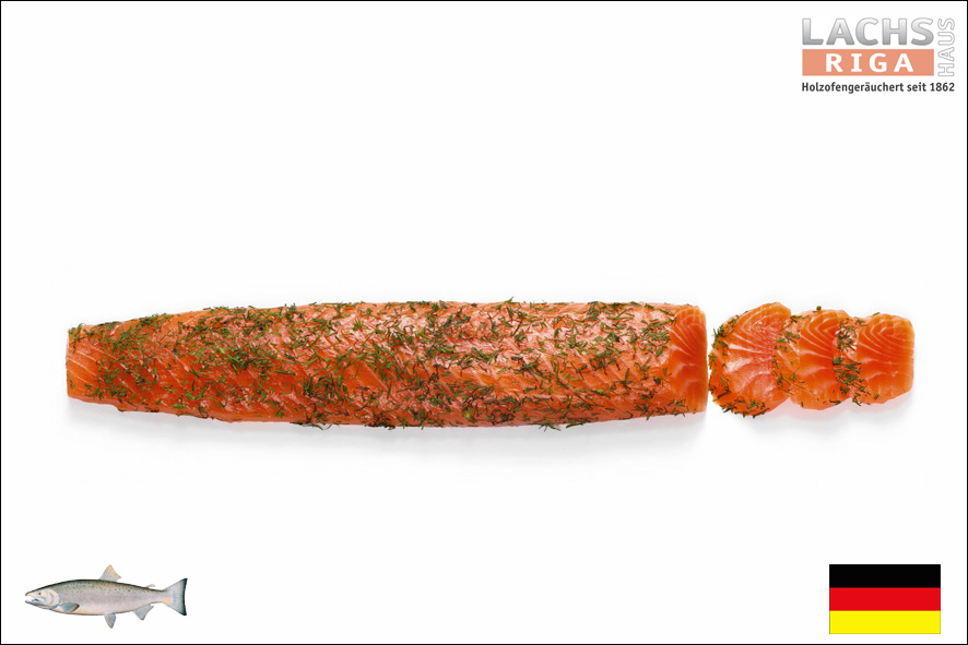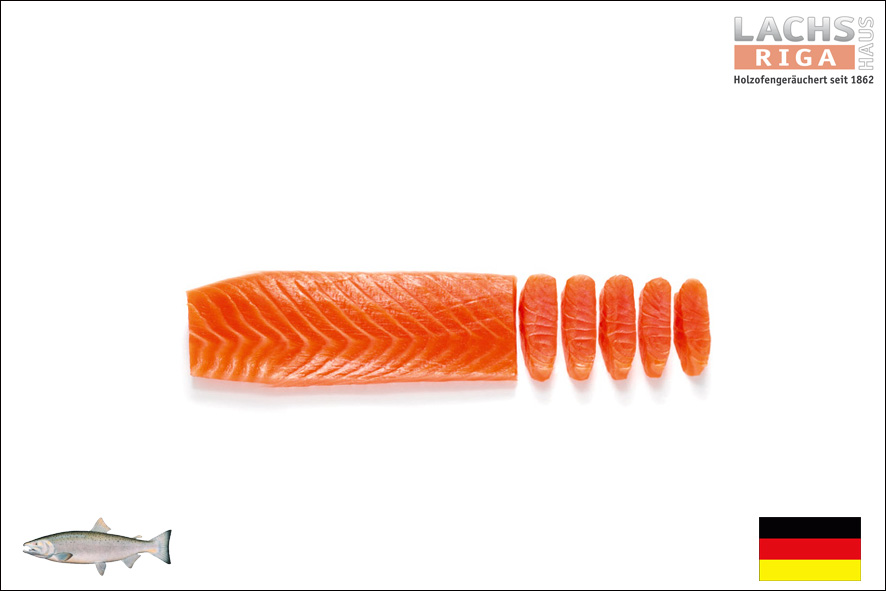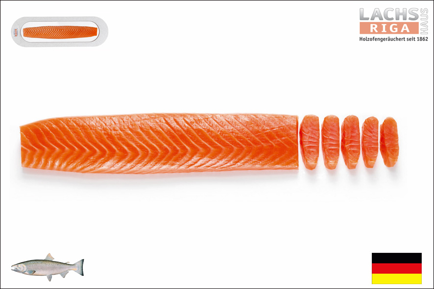 Das Rückenfilet eines ausgewählten schottischen Lachses ist das edelste Stück, das kulinarische Finale für Kenner. Schon die individuelle Maserung eines jeden Original Riga-Filets gilt als Kunstwerk. Um diese herauszuarbeiten, sind höchstes Fachwissen und viel Fingerspitzengefühl erforderlich.