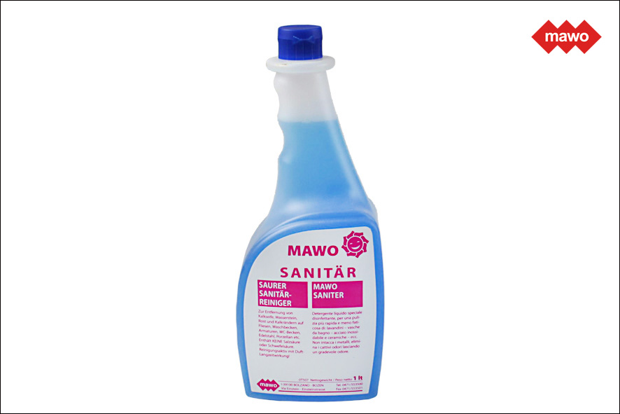 Mawo Sanitär ist ein saurer Sanitärreiniger für die tägliche Unterhaltsreinigung auf Basis von Zitronensäure. Entfernt mühelos Verschmutzungen, insbesondere fetthaltigen Schmutz (Hautfett, Öl, Cremen) und Kalkschleier. Für alle säurefesten Materialien wie Fliesen, Waschbecken, Armaturen, Spülbecken, Porzellan, Glas, Edelstahl und Kunststoffe (ausgenommen Polycarbonat) geeignet. Nicht auf Marmor oder säureempfindliche Materialien bringen!