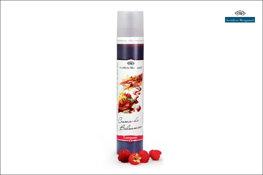 Süss-saure Soße, gewonnen durch Reduktion und Verdickung von Balsamico-Essig, gemischt mit Himbeeren. Creme zum Dekorieren und Würzen von süßen und herzhaften Speisen. Es bleibt kompakt und bietet einen perfekten visuellen Effekt. Zarter Geschmack, der das Aroma der Gerichte unterstützt.