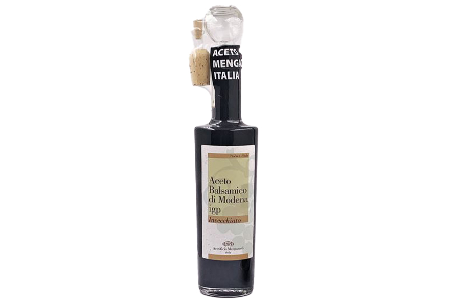 Aceto Balsamico di Modena IGP invecchiato, hergestellt mit einem Anteil von 85% an Traubenmost, süss und besonders dickflüssig. Besonders geeignet für warme Gerichte, Desserts und Obst.
