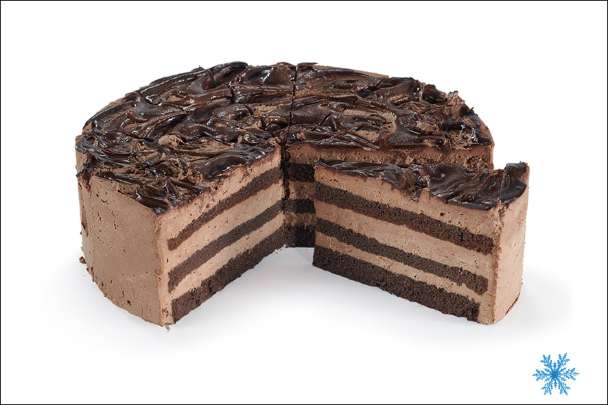 Eine lecker-leichte Schoko-Mousse-Sahne zwischen drei Lagen extra dunklem Schoko-Tortenboden mit einer aufwendigen Dekoration aus einer kakaohaltigen Fettglasur. Die Torte ist vorgeschnitten zu 12 Portionen und hat einen Durchmesser von ca 24 cm und eine Höhe von 8,4 cm. Ohne Palmöl.