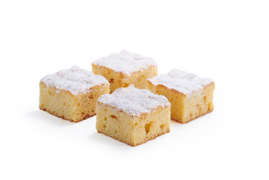 Fruchtig frischer Rührteig mFruchtig frischer Rührteig mit Zitrone, dekoriert mit Hagelzucker und Dekorpuder. Einfach köstlich! Vorgeschnitten in 24 Portionen. Ohne Palmöl.