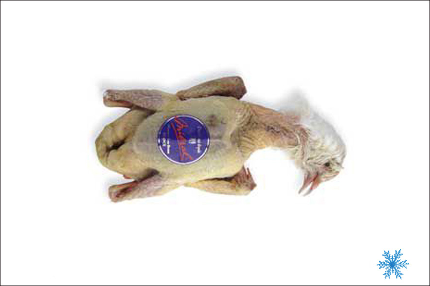 Taube (lat. Columbidae), handwerklich gerupft, mit Kopf und Füße, ohne Magen und Gedärme (éffilé). Das Fleisch von Tauben ist zart und besitzt ein wohlschmeckendes, kräftiges Aroma. Das Taubenfleisch ist rötlich gefärbt. Diese Taubenrasse wird in Frankreich mit 80% Mais und Soya gefüttert. Tauben eignen sich zum Braten aber auch für die Zubereitung von Frikassee.