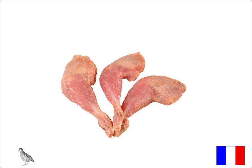 In Frankreich gezüchtete Wachtel (Coturnix coturnix) . Keule mit Knochen. Das Fleisch der Keule hat einen Eiweißanteil von etwa 25 Prozent und einen Fettanteil von 2,5 Prozent. Die Wachtelkeulen haben ein zartes, wohlschmeckendes Fleisch und eignen sich ausgezeichnet zum Braten. Jeder Karton beinhaltet 8 Packungen a 10 Stück.
