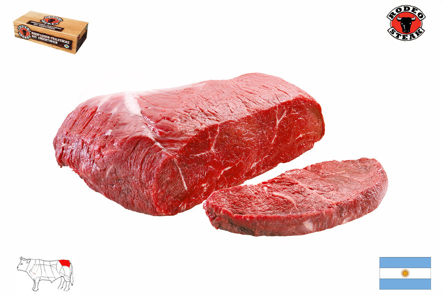 Das Rinderhüft-Filet ist der kleinere Muskel der Steakhüfte. Dieses Teil, welches dem Filet sehr ähnlich ist kann verwendet werden zum Schneiden von zarten Medallions. Da das Fleisch sehr gut abgehangen und folglich sehr zart ist, wird empfohlen die Steaks medium oder rare zu servieren.