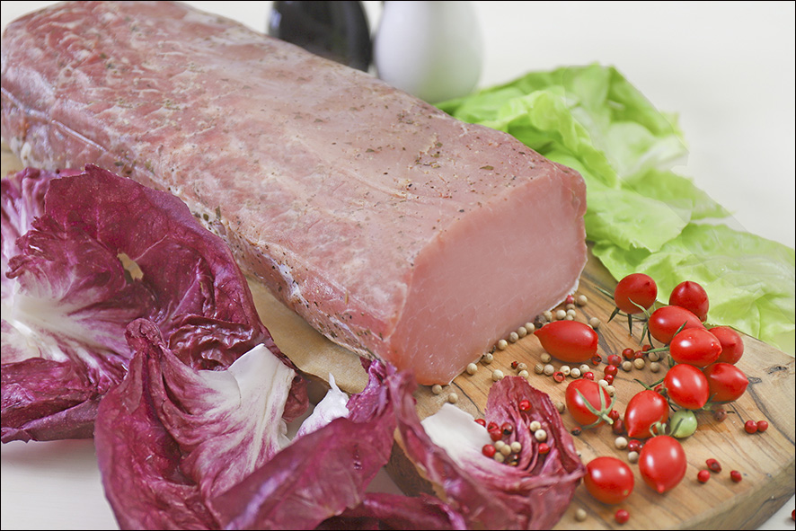 Handwerkliche Produktion in kleinem Familienbetrieb in den Apenninen, nur Rohmaterial aus eigener Schlachtung, beste Würzmittel aus tradizionellen Rezepten. Schweineruecken wird schonend entbeint und gewuerzt. . Mageres Produkt, fein und mild im Geschmack. Ideal als Carpaccio und für kalte Vorspeisen und Buffets, garniert mit Zutaten welche zur Saison passen.