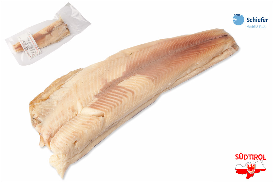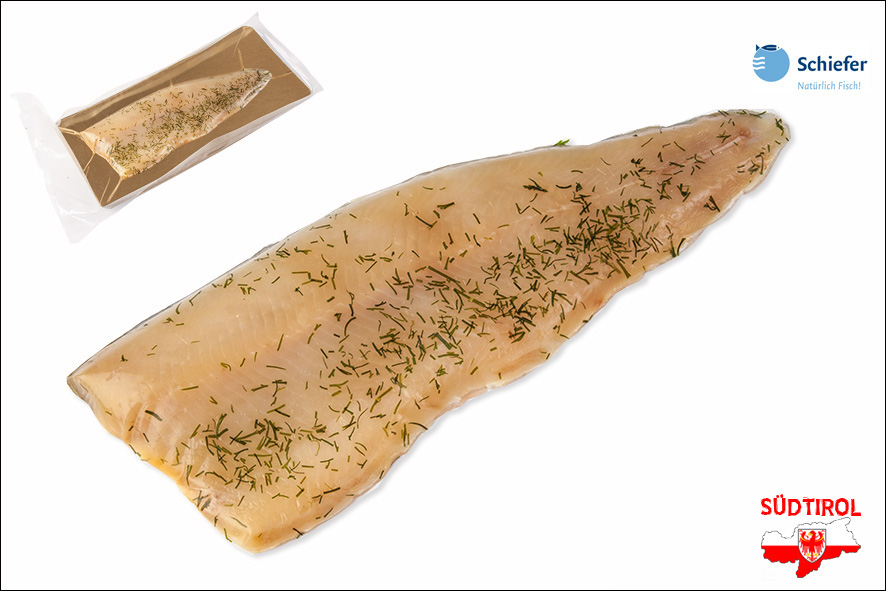 Die Lachsforellen werden in einer Zucht im Passeiertal aufgezogen. Anschließend wird das Filet geräuchert und gebeizt wie ein Südtiroler Speck, aber natürlich nach Geheimrezept. Tolles Produkt für ein leichtes Essen, für eine Vorspeise oder auch Hauptspeise.