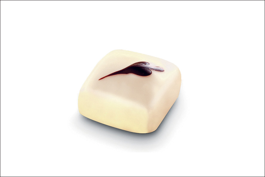 Vanille Ganache umhüllt von weißer Schokolade. Durchschnittliches Gewicht pro Stück: 10,5 g; Abmessungen: 35x335x15 mm.