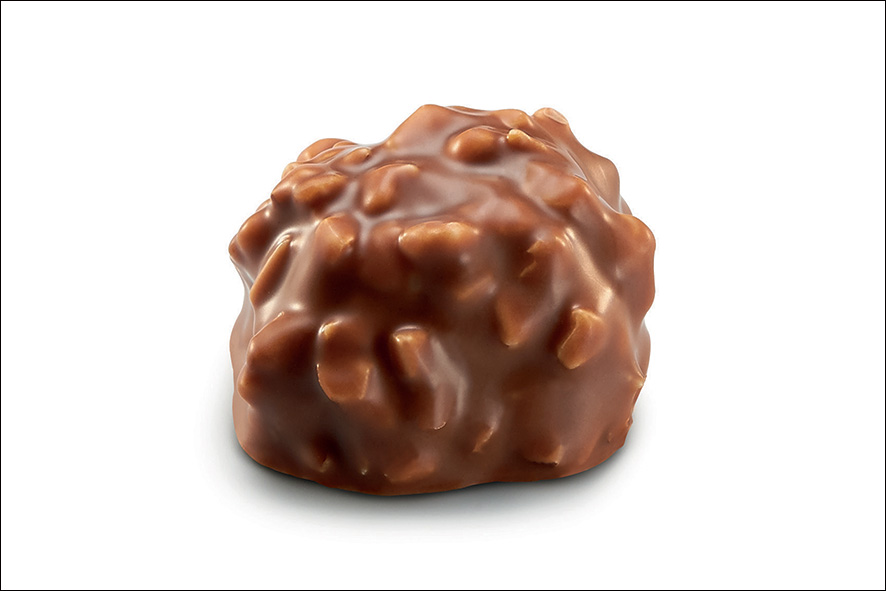 Haselnuss und Mandelpraline, überzogen mit Milchschokolade und dekoriert mit Mandelgranulat. Durchschnittliches Gewicht pro Stück: 11 g; Abmessungen: 3cmx3cmx2cm