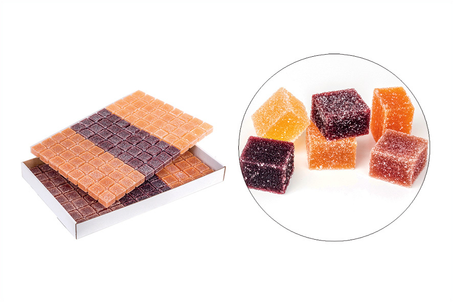 Fruchtgelees in 6 verschiedenen Geschmacksrichtungen: Aprikose, schwarze Johannisbeere, Zitrone, Himbeere, Mirabelle, roter Weinbergpfirsich. Frischer und leicht säuerlicher Fruchtgeschmack, umhüllt von einer feinen Schicht Kristallzucker. Weiche Konsistenz.