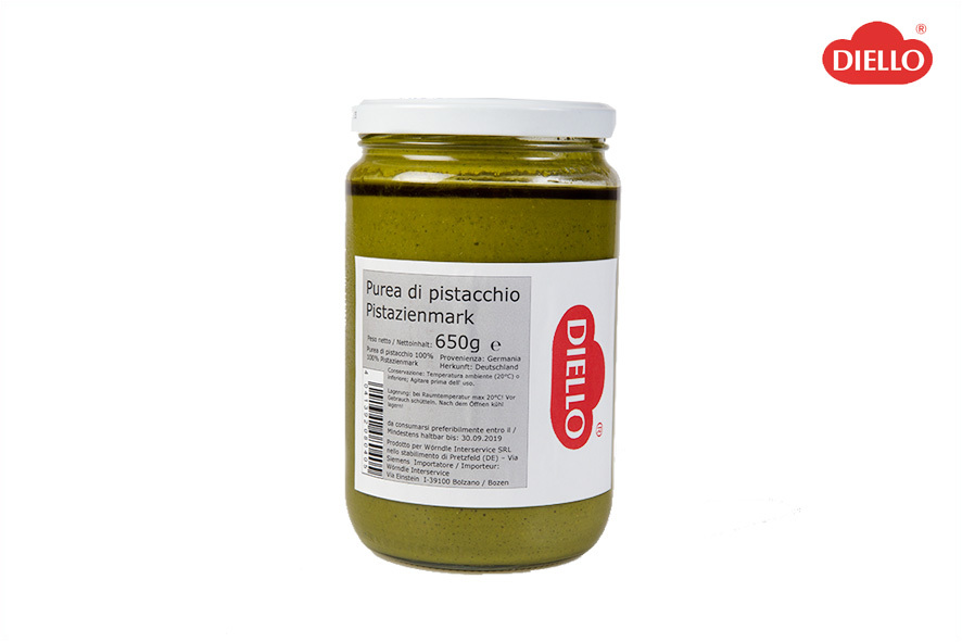 Ein Püree aus Pistazien. 100% iges Mark, ohne Konservierungs- oder andere Zusatzstoffe. Da es den absoluten Geschmack nach Pistazien hat, dient es optimal zum Aromatisieren von Kuchen, Cremes, Sahne, Milchshakes, Eis sowie zum Färben von weißer Couvertüre.