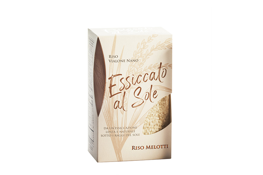 Sonnengetrockneter Vialone Nano-Reis - SELEZIONE PREGIATA. Zwei Wochen lang auf natürliche Weise an der Sonne getrocknet, nach einem alten landwirtschaftlichen Verfahren, das dem Korn eine größere Konsistenz und eine ausgezeichnete Kochfestigkeit verleiht. Ideal für die Zubereitung von gekörnten und/oder aufgeschlagenen Risottos. Kochzeit: 16-18 Minuten.